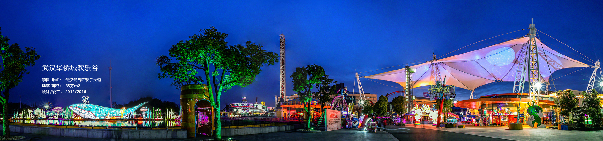 武漢歡樂谷占地約35萬平方米,于2012年4月29日開園迎賓,其由夢想大道、卡通工廠、歡樂時光、極速世界、漁光島、羽落天堂、颶風灣、歡樂江城八大主題區域組成。武漢全新設置了100多項娛樂體驗項目,包括30多項游樂體驗設備、40多處生態人文景觀、10多臺文化演藝精品和20多項主題娛樂游戲,精彩詮釋多元歡樂。園區夜景是游樂場氛圍的重要組成部分,武漢華僑城項目整個燈光建設由我司負責全面...